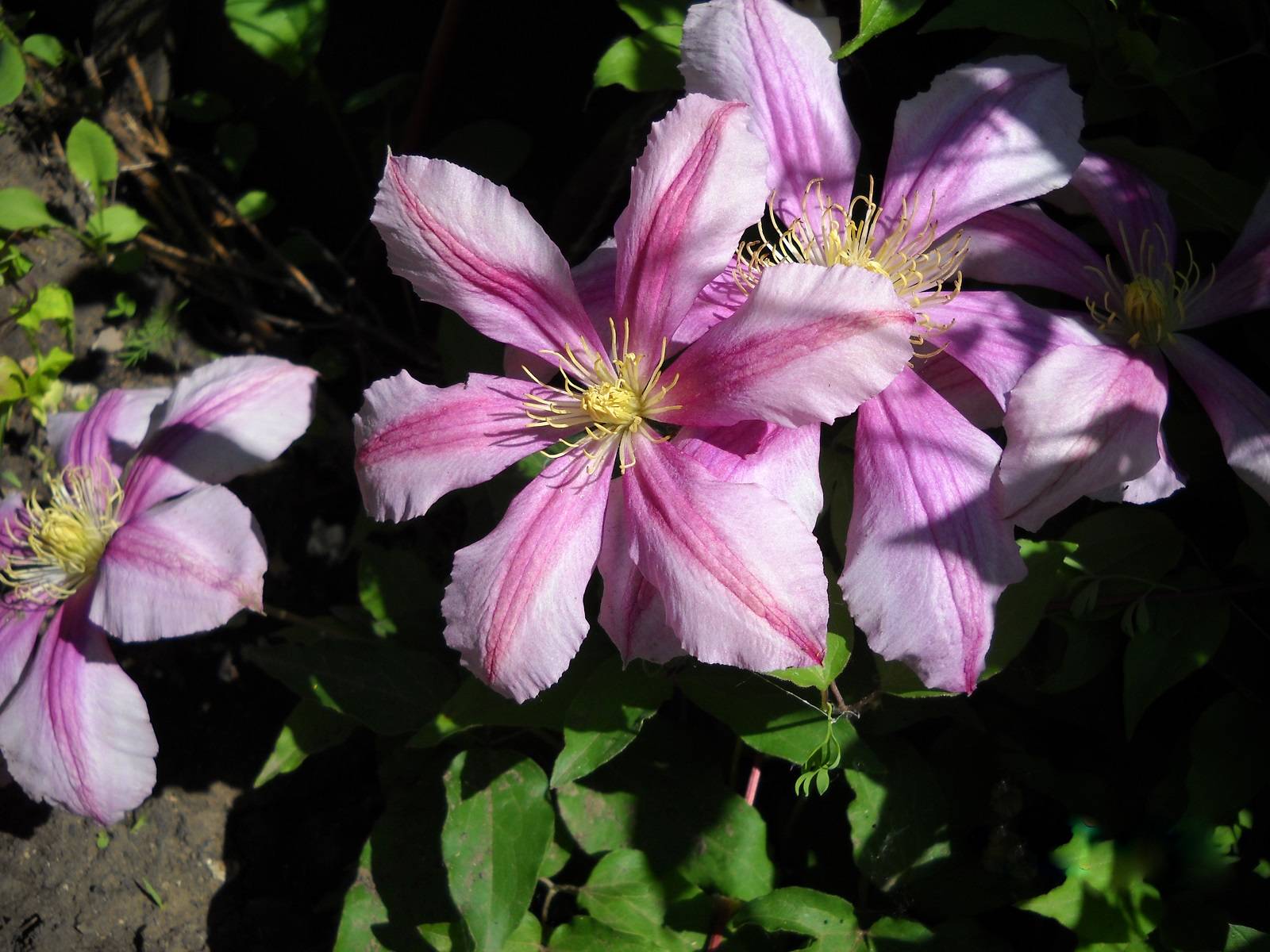Цъфтят обилно по издънките на текущата година сортове Памет на сърцето с лилави цветя и розов клематис Alyonushka.