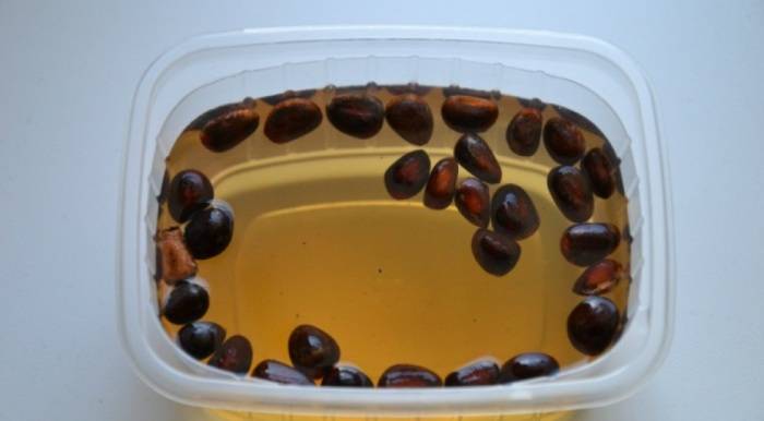 - Ядките се накисват в топла вода за 3 дни. Водата трябва да се сменя ежедневно. Можете да добавите стимулант към него, например корен.
