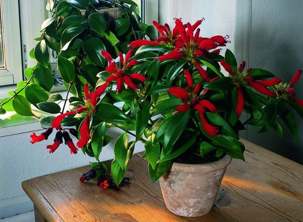 Основната характеристика на това къдраво стайно цвете е оригиналът, като обърнати съцветия с богат червен цвят. Растението обича светлината, но не понася пряка слънчева светлина. Той реагира отрицателно на резки температурни промени и течение. Оптималната температура през лятото е около 23-25 ° C, през зимата есхинантусът е удобен при 15-17 ° C.