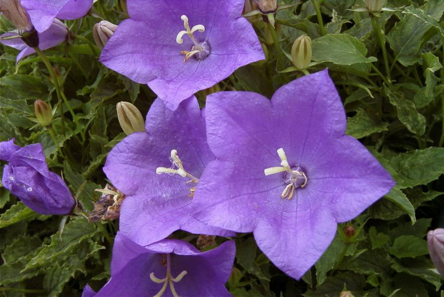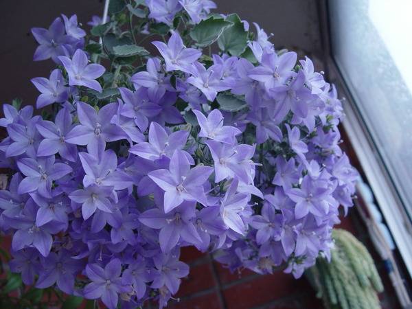 This type of campanula includes the beloved bride and groom. The diameter of the flowers is up to 4 cm, the leaves are green with slight pubescence. This is an ampelous type of campanula that prefers growing in hanging pots and pots.