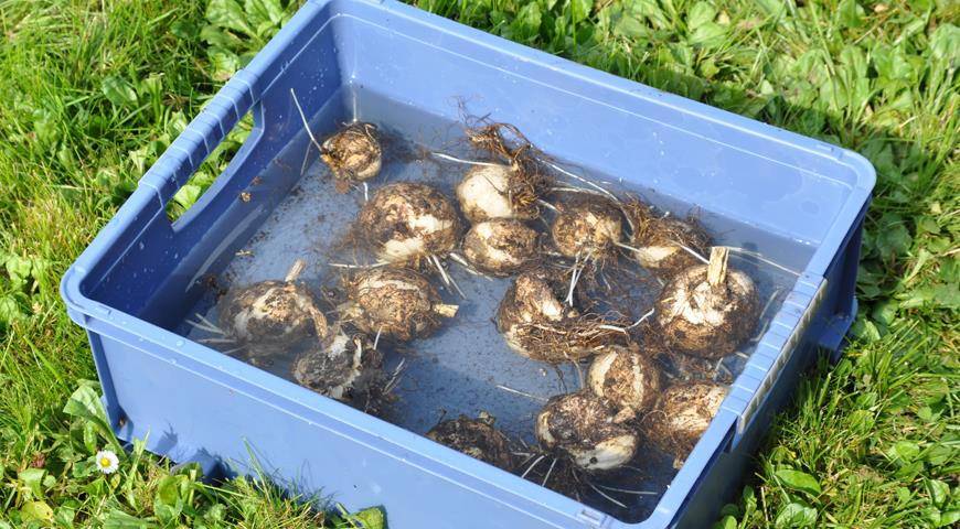 Before putting the bulbs for storage, they need to be soaked for about half an hour in a solution of potassium permanganate (0.2 mg per 1 liter of water) or in phytosporin (a preferable option), this will protect them from pests and the development of diseases. After that, dry well and put in plastic or wooden boxes, you can in cardboard boxes, preferably so that the bulbs do not touch each other. It will be good if a layer of dry river sand is poured onto the bottom of the container. These measures will keep the bulbs intact and intact until the appointed time.