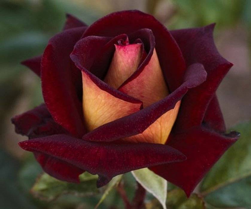 The flower petals have a rich burgundy color with a golden tint. The buds are large, their diameter can reach 12 cm. During flowering, the bushes exude a pleasant, but not very intense aroma. About 3-5 buds are formed on each stem. Before opening, they have a goblet shape. During flowering, the petals may have a brown tint. A large amount of green mass is formed, the size of the leaves is medium, the color is bright green.
