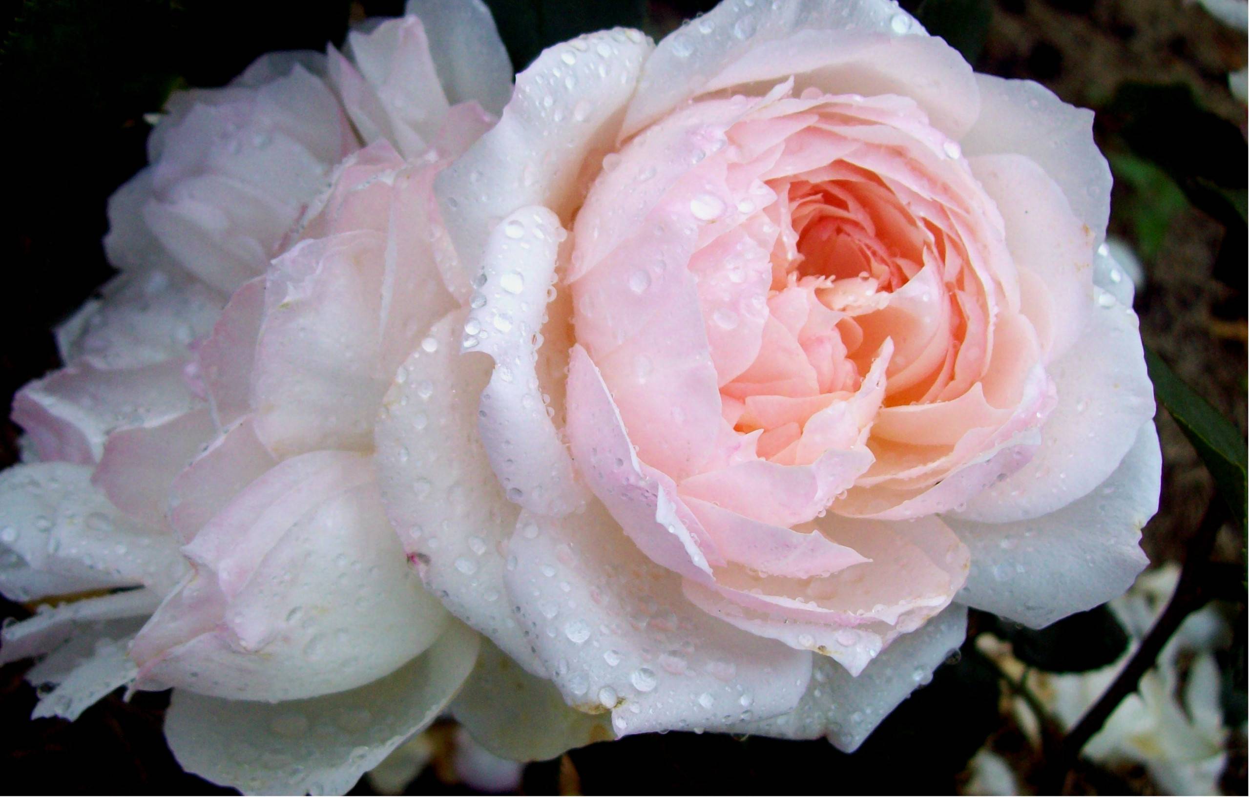 - double cream-colored flowers, fade to white in the bright sun, each flower has about 35 petals;