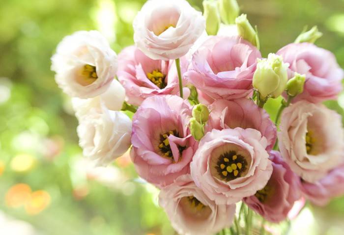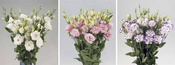 - Eustoma (lisianthus) Pink Florida - pétalos rosáceos.Las flores crecen en forma de ramo.