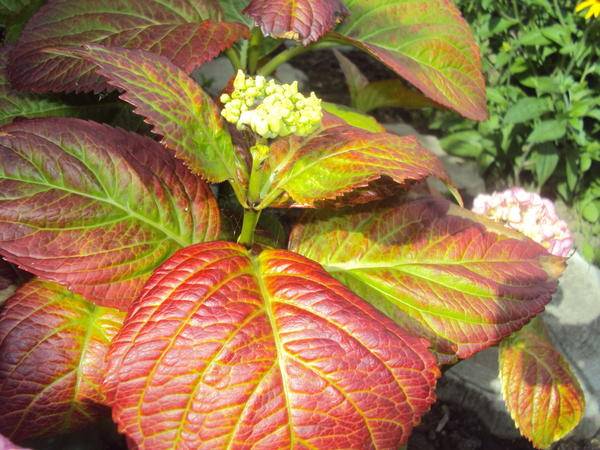 Hydrangea soporta fácilmente la influencia de un clima severo y no sufre mucho por las altas temperaturas. Sin embargo, en el calor, debes tener cuidado. Las hojas rojas de la hortensia pueden deberse a la exposición directa al sol.