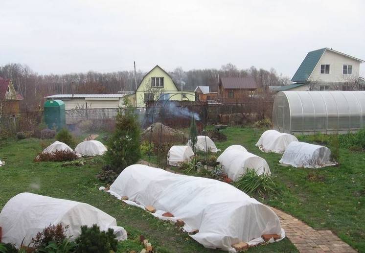 Para el material de recubrimiento, se prepara un marco de alambre grueso. La arpillera se usa como refugio, no interfiere con el intercambio de aire. Los bordes de la arpillera se presionan contra el suelo y se fijan con materiales a mano.