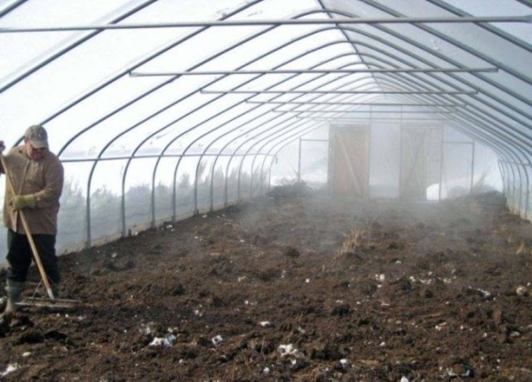 Les travaux de serre au printemps visent à améliorer la qualité du sol, à éliminer les ravageurs et à contrôler les mauvaises herbes. Si le sol était recouvert de paillis pour l'hiver, il est sorti de la serre. Il est particulièrement important de le faire si un matériau résineux a été utilisé, car il oxyde fortement le sol. Le sol est ameubli et des engrais sont appliqués (excréments de poulet, humus, fumier, potassium, phosphore). La meilleure période pour un tel travail est la fin mars.