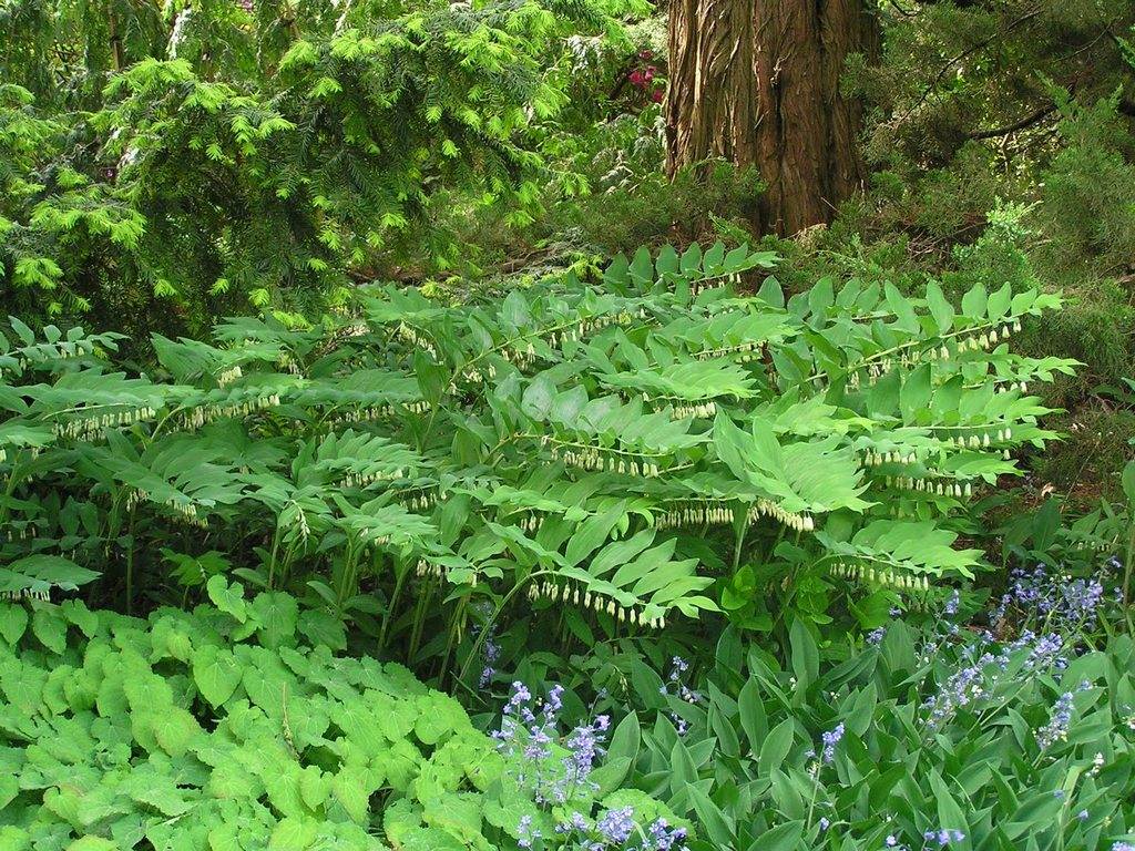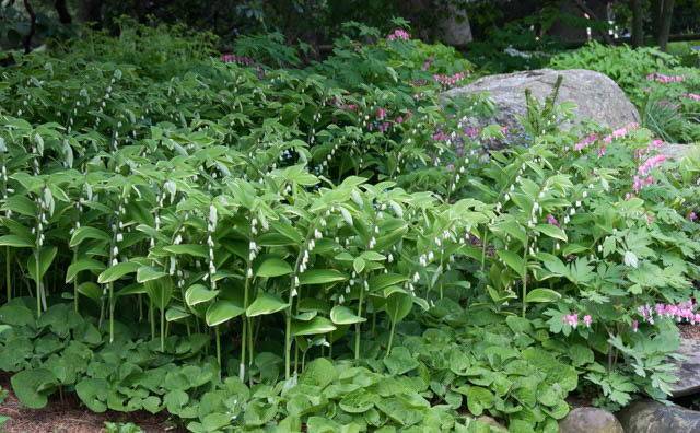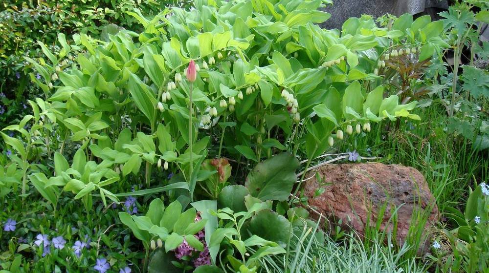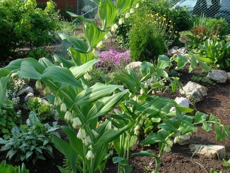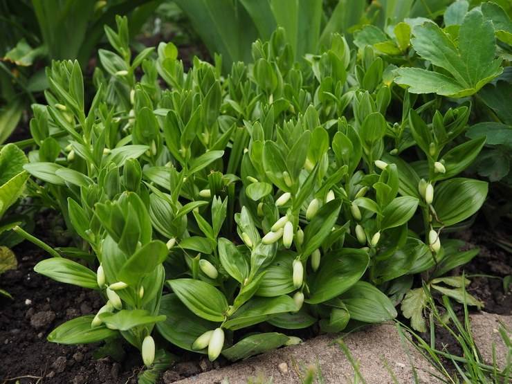 Kupena est impressionnant sur fond de grosses pierres et de compositions en bois. La plante est plantée pour encadrer des étangs décoratifs en combinaison avec des géraniums forestiers, des iris-iris et des primevères.