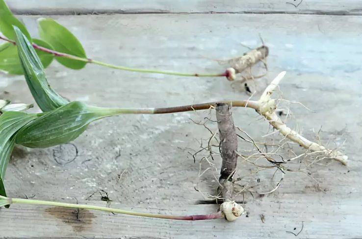 Le rhizome pousse dans une direction horizontale, se lignifie au fil du temps, devient multi-générationnel. Les racines et les bourgeons hivernent dans le sol, le feuillage meurt à l'automne. Au début du printemps, de nouvelles tiges poussent à partir des bourgeons aux extrémités de la racine. Sur le rhizome, des traces de tiges mortes à la fin de chaque saison sont clairement visibles, ce qui permet de déterminer l'âge de la plante.