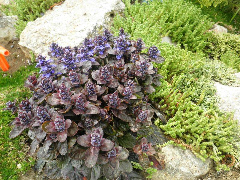 - Orientale (Ajuga orientalis) è un'erba tenace nana, che raggiunge un'altezza non superiore a 12 cm e fiorisce con fiori viola.