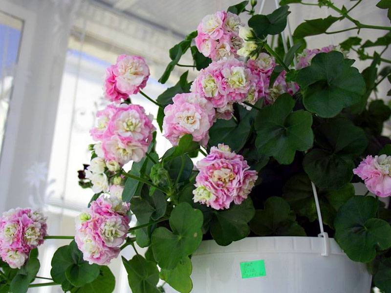 Pelargonium Pak Viva Carolina ha una corona di edera, gemme densamente doppie, steli pendenti. L'ampio cespuglio cresce steli lunghi fino a 1,5 m.