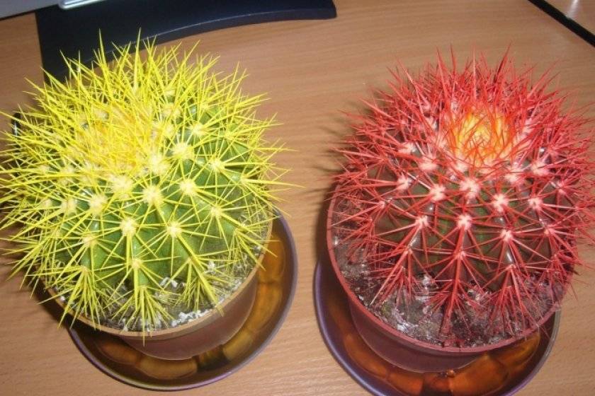 - ехинокактус Дъга. Продавачите не се ограничават да оцветяват тръните само в червено. В Rainbow те са оцветени: лилаво, оранжево, неестествено жълто, розово. С израстването си стъблата се удължават и продълговат.