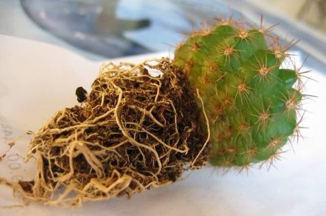 След като почукате по стените на саксията, трябва да извадите цветето с пинсета до кореновата шийка. След това трябва внимателно да изследвате корените. Ако изведнъж сред тях има гнили и болни, те трябва внимателно да бъдат отсечени и обработени със сяра или въглен. След това можете да трансплантирате кактуса в нова саксия с много дренажни отвори.