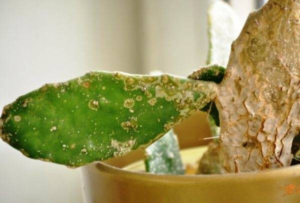 - Кафяви петна по леторастите. Това може да се случи поради излишната влага в почвата. За да се поправи ситуацията, засегнатите части се изрязват, бодливата круша се трансплантира в суха почва и се регулира поливането.