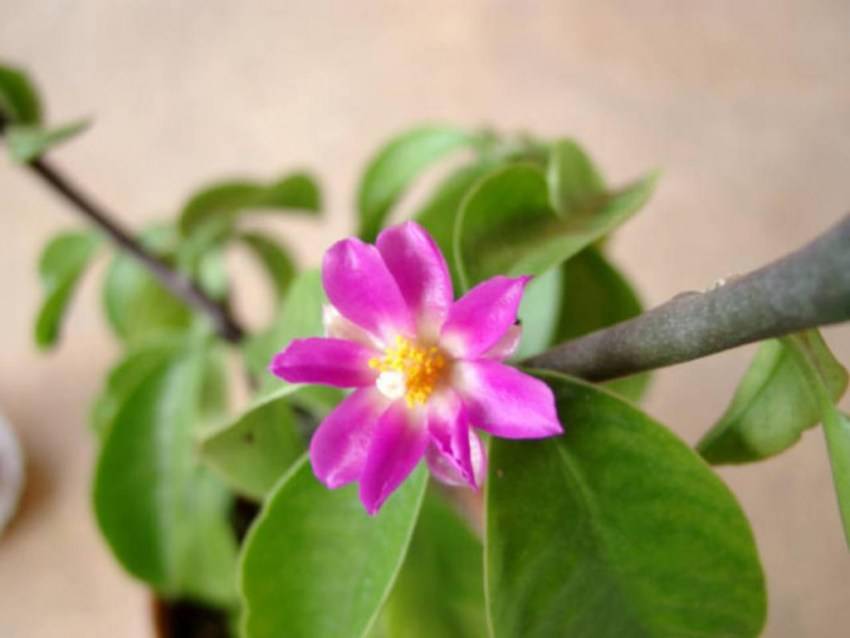 Формата на листните плочи е яйцевидна или овална, дължината им варира от 3-5 см. Ръбът е равен, а върхът е леко заострен. Лъскавата повърхност намалява скоростта на изпаряване на влагата.