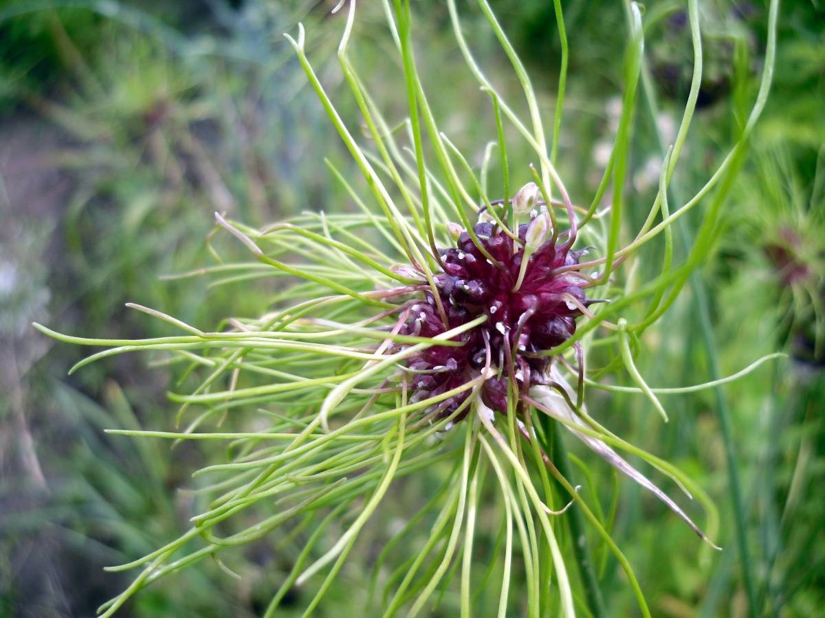 Нарича се кръгла глава, барабанни пръчки, сфероцефал. Косата от алиум е родом от Южна Европа, среща се в Северна Африка и Западна Азия. Прародителят е лукът-батун. Чадърът на чадъра има нестандартна овална форма. Дръжките се простират до 40 см, а в долната част са удебелени и боядисани в розово-бяло, потъмняващи до лятото. Докато цъфтят, цветята растат обрасли с дълги зелени листенца, които приличат на дебели косми. Общият размер на съцветието е около 4 см в ширина. Цъфтежът започва в началото на май и продължава до юли.