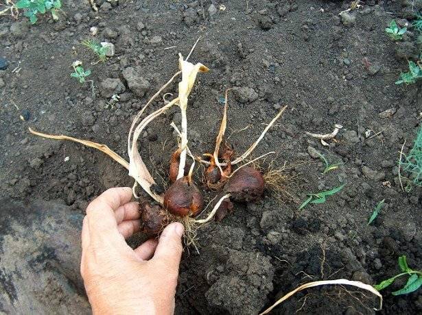 Растенията трябва да се изкопават внимателно, за да не се повредят луковиците или бебетата. Освен това грижата за изкопаните луковици се състои от следните стъпки: