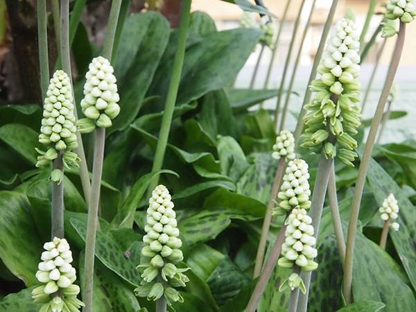 Представител на семейство Аспержи. Той има необичайна форма на листа под формата на шушулка. Дължината на листата е около 15 см. В разгънато състояние той достига 35 см. Когато навън е много горещо, цветето се извива на спирала, като по този начин задържа влагата. Бели цветя под формата на камбани цъфтят на висок дръжка. Миниатюрен лук с диаметър не повече от 5 см също е бял.