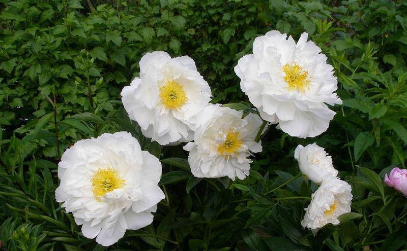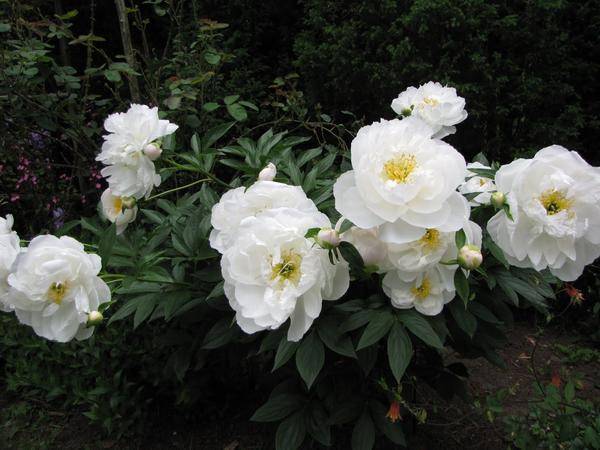 Tanaman warna yang sesuai harus digunakan sebagai tambahan. Perbungaan putih sesuai dengan warna merah dan merah tua, jadi peonies dapat digabungkan dengan anyelir. Untuk menekankan kesegaran, iris, loceng, honeysuckle boleh digunakan sebagai teman. Bunga juga boleh ditanam di sebelah konifer.