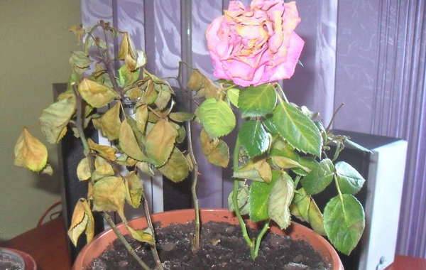 Mengapa mawar menumpahkan daunnya? Bagi spesies domestik, tahap kelembapan udara yang rendah menjadi merugikan. Masalah jatuh berlaku selepas permulaan musim pemanasan, anda boleh menyingkirkannya dengan bantuan: