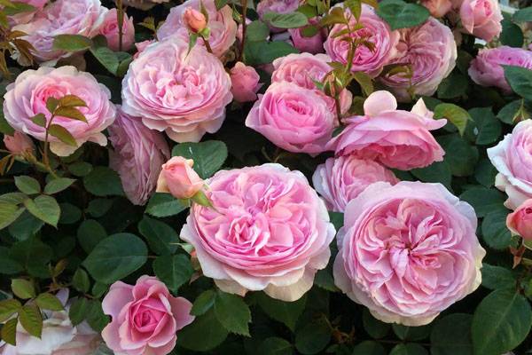 Kepelbagaian bahasa Inggeris dicipta di taska D. Austin. Mawar warna merah jambu pucat kelihatan canggih, anggun di mana-mana kawasan. Pereka landskap membuat komposisi yang indah dengan bunga-bunga ini.