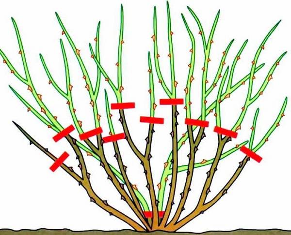 Pemangkasan adalah prosedur penting untuk pelbagai ini. Terdapat beberapa jenis: kebersihan, pembentukan, anti-penuaan. Pemangkasan utama (kebersihan) dilakukan setelah membuang tempat perlindungan untuk musim sejuk. Buah pinggang belum boleh bangun. Potongan dibuat tepat pada sudut 45 darjah. Semua yang sudah usang, kering dipotong.