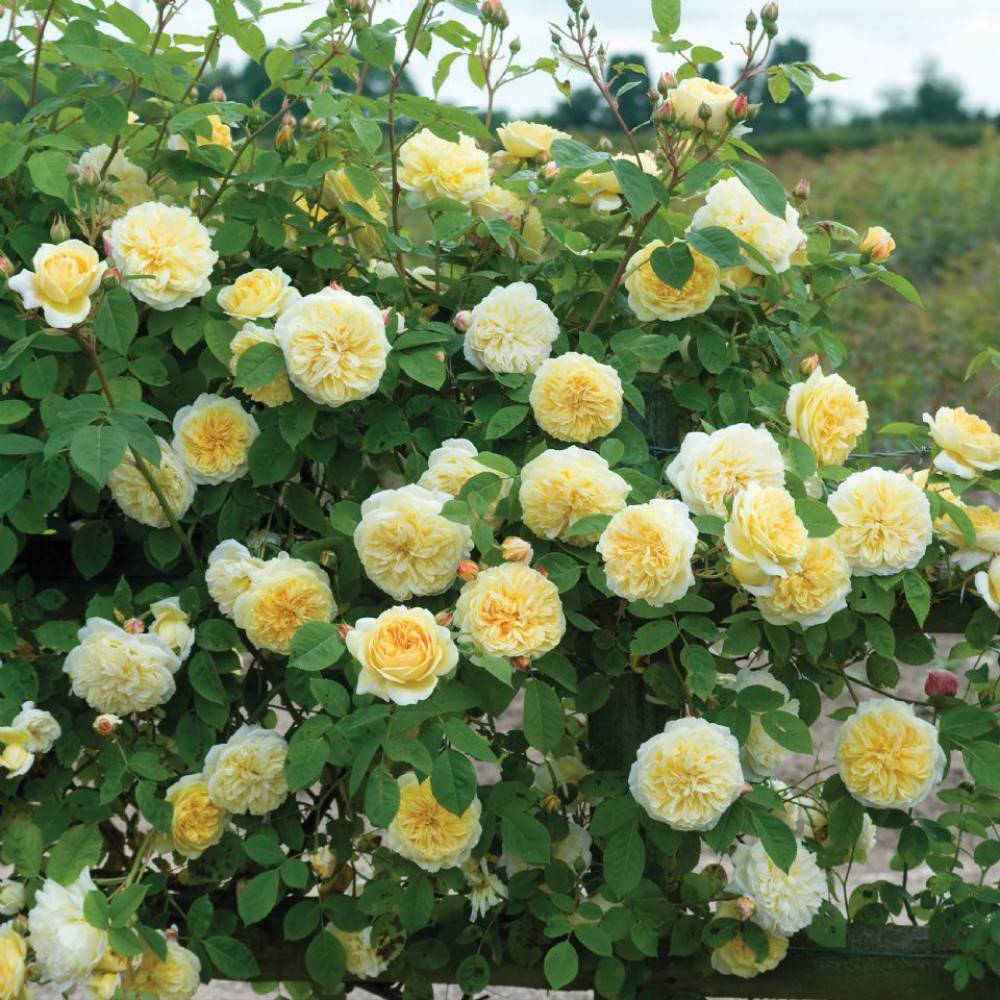 Semasa berbunga, mawar besar berwarna kuning pucat atau putih terbentuk dengan buah atau aroma manis yang kaya. Pada batang, duri hampir tidak ada, indikator ketahanan terhadap penyakit rata-rata.