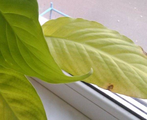 Bagaimanakah kekuningan daun spathiphyllum muncul?