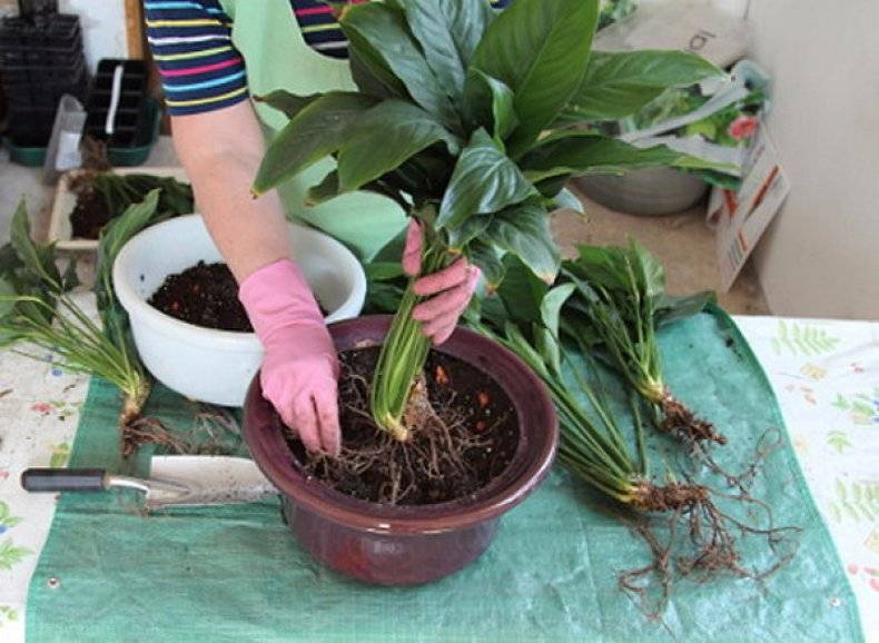 Semasa melakukan pemindahan, anda perlu memantau keadaan akarnya: memotong yang rosak dan kering, setelah memproses titik potong. Tanah mesti sesuai untuk tanaman aroid. Ia juga mesti mengandungi lapisan saliran. Akarnya perlu disebarkan dengan teliti di atas gundukan tanah, tertidur di atas dengan bahagian substrat baru. Selepas itu, tidak digalakkan memberi makan bunga selama sebulan.