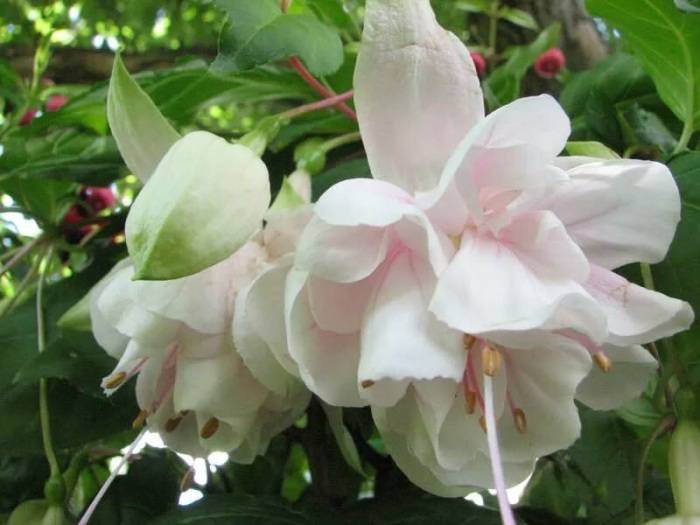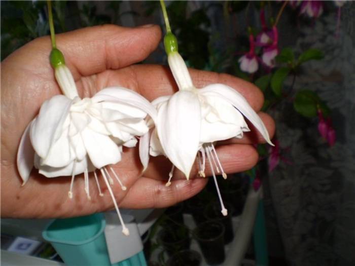 Witte variëteit verkregen door Engelse fokkers in 1978.De bloemen zijn dubbel en groot, alsof ze gemaakt zijn van duur porselein. In het licht worden de bloembladen lichtroze. Daarom, als het nodig is om de sneeuwwitheid te behouden, moet deze tegen direct zonlicht worden beschermd. Fuchsia Anabel bloeit lang. Kan gevormd worden als hoogstam.