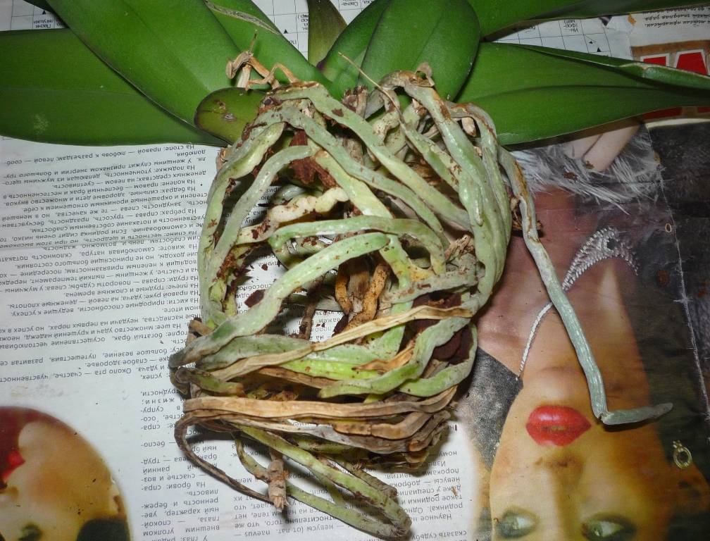 Корените се изследват и повредените части се отстраняват. След като орхидеята е засадена в нова саксия, която след това се поставя на тъмно място за 3-4 дни. Това е необходимо, за да може растението да си почине и да се справи със стреса.