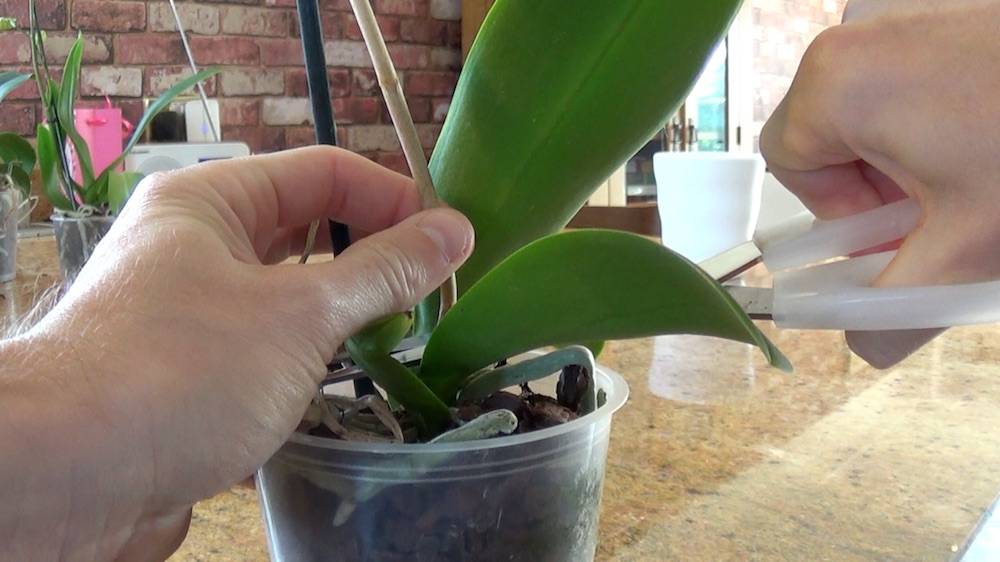 Съкращаването на стъблото или пълното му премахване винаги е стрес за растението и следователно, след извършване на тази процедура, производителите на цветя препоръчват да не го безпокоите.След известно време можете да започнете да се грижите за орхидеята, както преди момента на рязане: поливайте умерено, напръскайте листата и корените.