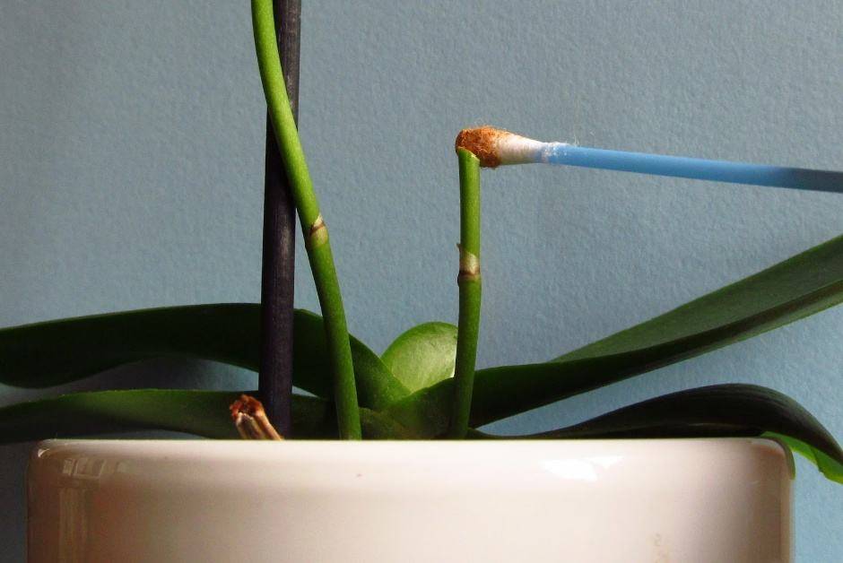 - Изсушаване на стъблото. Ако е напълно изсъхнало, е необходимо да го премахнете. Но ако все още е зелено, тогава не трябва да го докосвате, защото то насища растението с полезни микроелементи и хранителни вещества за по-нататъшен растеж и възстановяване на орхидеята.