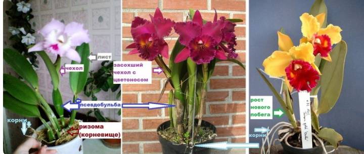 Вътрешните видове Cattleya са многобройни хибриди, получени чрез смесване на различни видове Orchidaceae. Те приличат на храсти с няколко повърхностни издънки и хоризонтално коренище - коренище (фалшива крушка). От коренището нишките на корените растат надолу. От пъпките на коренището издънките растат нагоре - удебелени стъбла (псевдолуковици или просто луковици), в които се натрупват хранителни вещества и влага. Формата на крушката прилича на сплескано вретено.