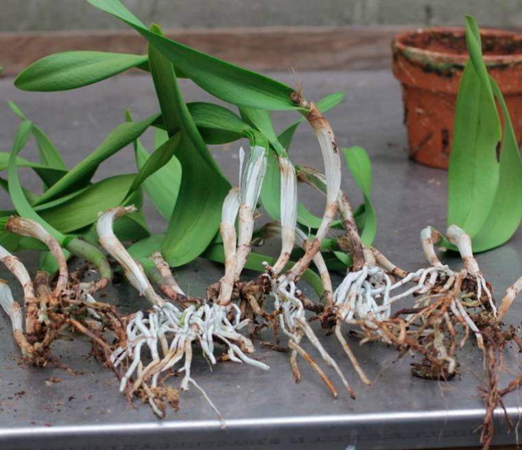 За да расте корени, растението се поставя в мини оранжерия с дренажни отвори. На дъното са поставени дребнозърнест дренажен материал и мъх сфагнум. Мъхът винаги трябва да е влажен. Изгнилите корени на цветето се отрязват, коренището се третира с Fundazol и след това след изсушаване се накисва за 20-30 минути в разтвор на Kornevin или просто се напудрява със сух прах. Цветето е поставено върху мъх сфагнум, горната част на коренището също е покрита с тънък слой мъх. Върху контейнера се поставя прозрачна капачка.