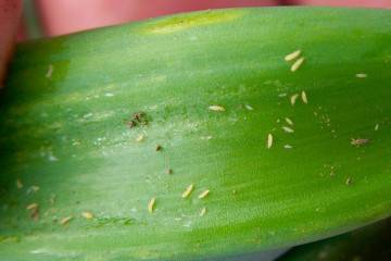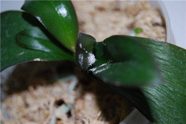Ако орхидеята е покрита с малко количество бял цвят, струва си да почистите цветето. Яйцата и възрастните трябва да се отстраняват с памучен тампон, напоен с алкохолна тинктура от невен.Също така е важно да изплакнете всички лепкави секрети.