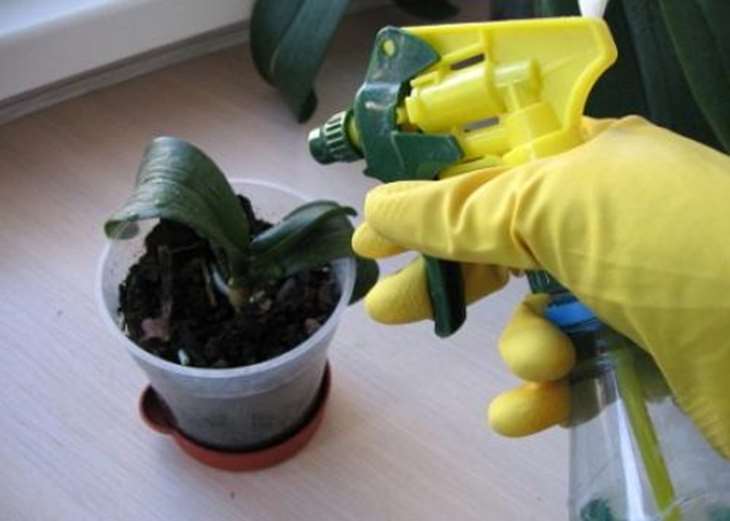 За да излекувате орхидея, трябва често да пръскате културата с вода. За да направите това, направете малка дупка в капака на пластмасова бутилка и изсипете вода с малко количество препарат в нея.