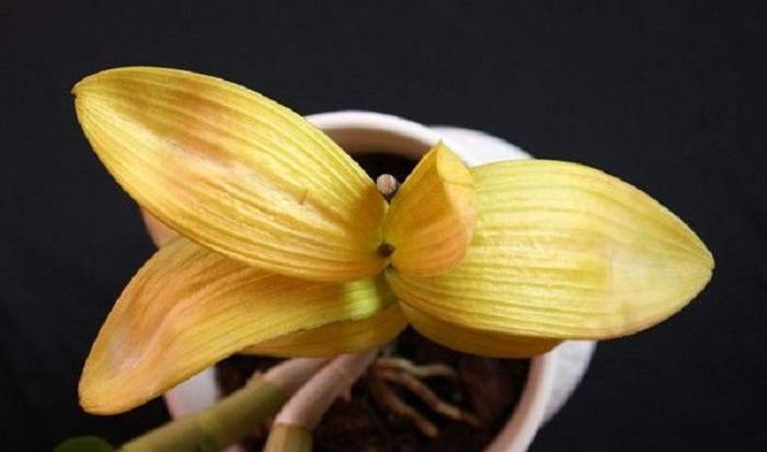 Малко количество хранителни вещества в почвата също може да повлияе негативно на растението. Орхидеята реагира особено остро на липсата на калий в субстрата. В този случай могат да паднат пожълтели горни листа, върху които са се появили жълти ивици. Необходимо е да се третира цветето чрез въвеждане на тор в почвата с необходимия компонент - калий.