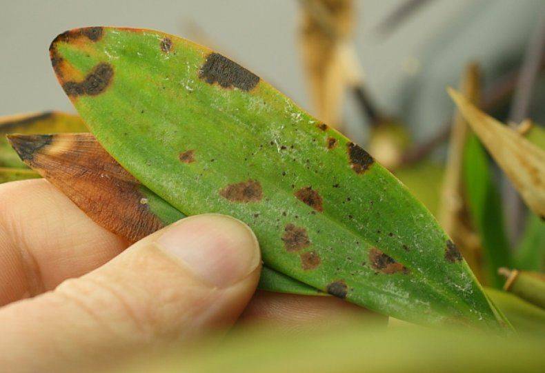 Черните точки по листата, които се появяват на орхидеята, показват развиващата се късна болест, характерна за това растение и доста опасна. Първоначално те могат да имат лилав оттенък, по-късно стават по-тъмни, до пълно почерняване. Причината обикновено е прекаленото поливане. Лечението трябва да започне незабавно.