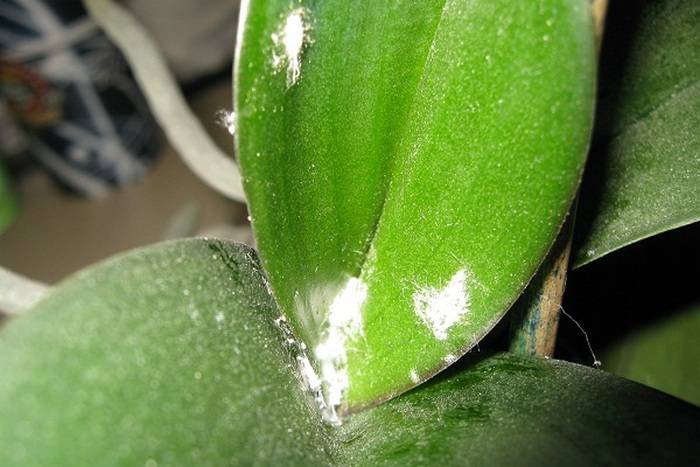 Ако долните листа на орхидеята са покрити с бял прозрачен цвят, тогава най-вероятно производителят е срещнал брашнеста мана. Петната бързо ще се разпространят в корените и издънките на цветето, то ще започне да изсъхва и да умира.