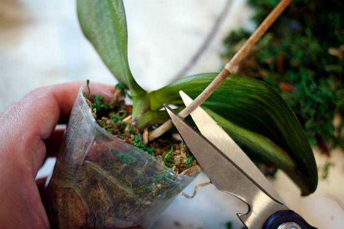 Изсушените корени и участъци с признаци на гниене трябва да се отрежат с дезинфекцирани ножици. Останалата част от коренището се потапя в предварително приготвен разтвор за 15 минути: 1 таблетка янтарна киселина се разтваря в 1 литър филтрирана вода. След това растението е напълно готово за трансплантация в нов субстрат.
