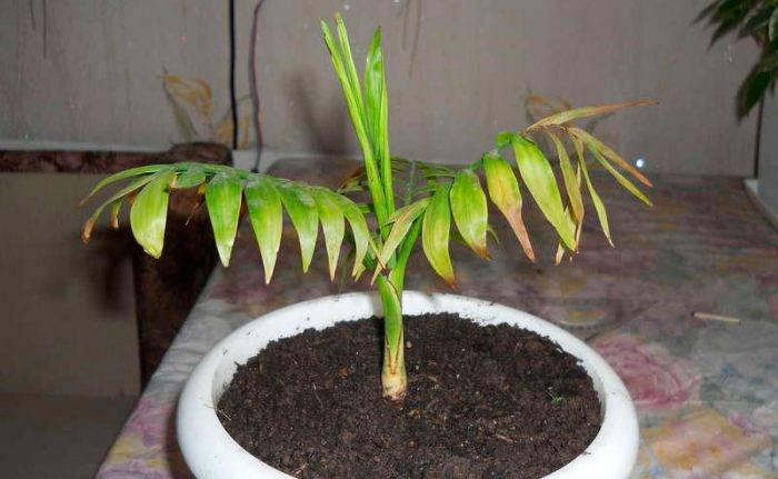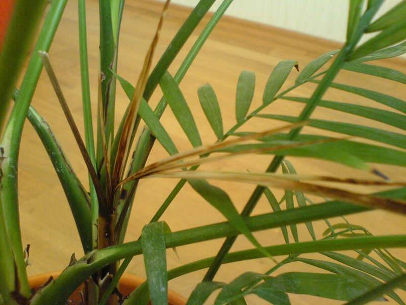 Пожълтяването и умирането на долните листа са естествена промяна в покритието на листата, тук не трябва да се притеснявате. Пресаждането на палмово дърво също може да доведе до изсъхване на върховете на листата, но това явление е временно, докато растението се адаптира към новите условия.