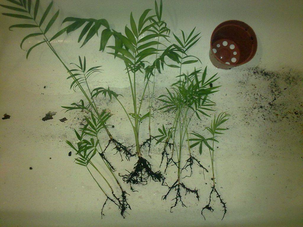 Корените на хамедореята се третират с фунгициди и инсектициди, отпадналите части се отрязват и се поставят в нова саксия. Трябва да се отбележи, че растението не понася добре пресаждането, поради което е необходимо да се действа много внимателно.