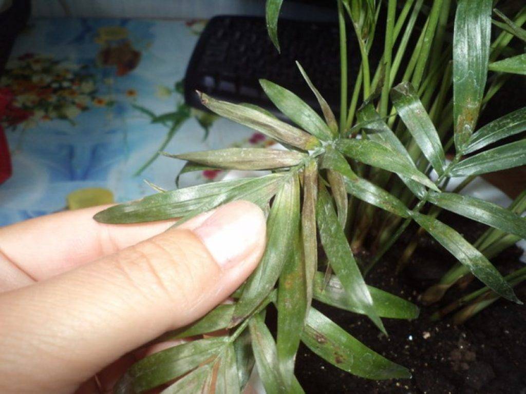 Ситуацията показва прекомерна влага в почвата и голямо количество торове в почвата. В този случай се препоръчва да се отрежат развалените листа, да се разхлаби почвата и да се остави палмата сама за няколко дни, докато течността се абсорбира напълно в почвата.