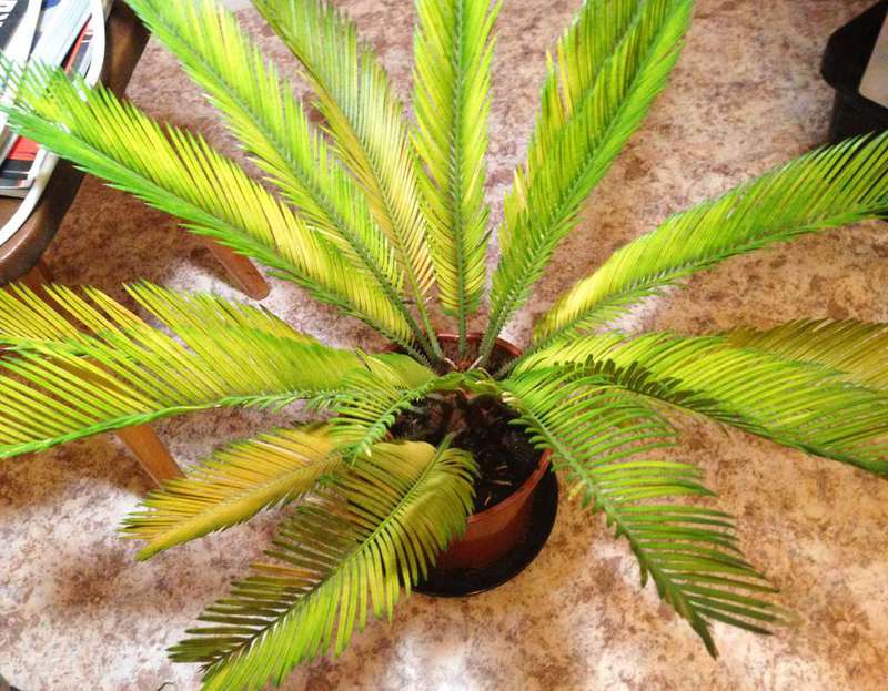 Ако малък брой листни плочи започнат да пожълтяват в увиснал цикас, не бива да се притеснявате, това е естествен процес на отмиране на листата. Промяна в цвета на цялата корона показва липса на влага или гниещи "конуси". В последния случай е необходимо да се премахне развалената част и да се трансплантира цветето.