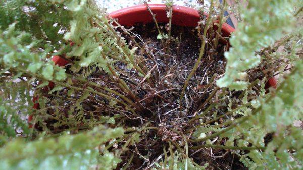 - ако коренът е започнал да гние, тогава трябва да извадите папрата от саксията и да отрежете развалените места;