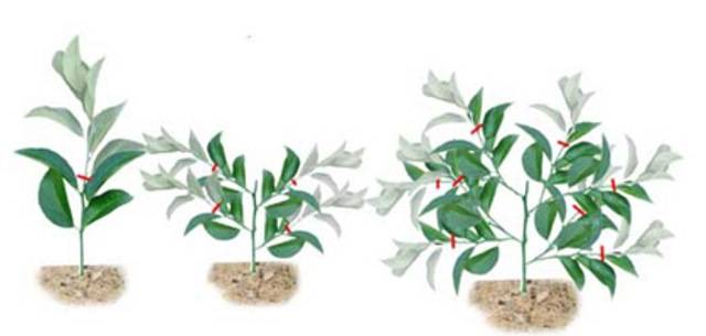 През втората година след засаждането растението трябва да бъде притиснато. За целта прищипете скелетните клони и върхове. Първото подрязване на горната част се извършва над 8-ия лист на дървото, а страничните издънки се прищипват над 5-ия лист.