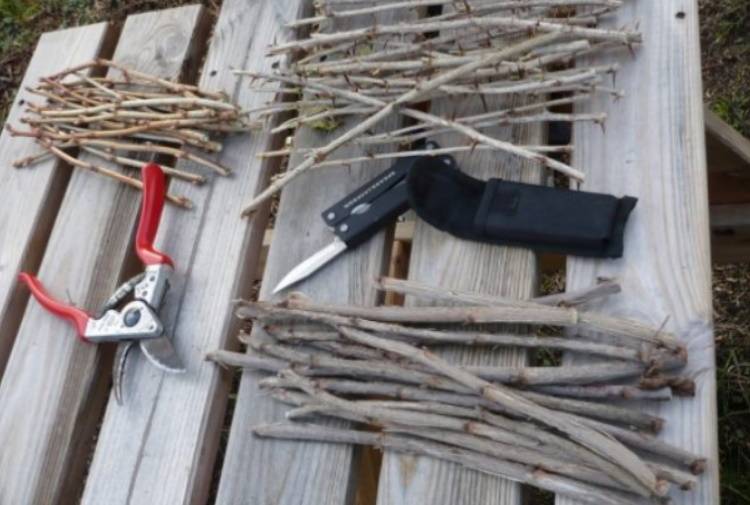 За изрязване на резници изберете здрави удебелени храсти на възраст 3-5 години, които са в началото на вегетационния период. Издънките се отрязват от растения, нарязват се на парчета с дължина до 15 см. На всеки сегмент трябва да останат поне 3-4 точки на растеж. Долният разрез трябва да е наклонен, направете го на разстояние 2,5 см от долния бъбрек. Горният разрез се прави прав - 1,5 см над бъбрека.
