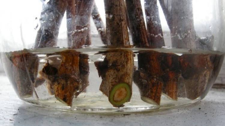 Резниците се вкореняват в мека вода, която не съдържа соли и примеси. По-добре е да използвате предварително съхранена стопена или дъждовна вода. На дъното на прозрачен съд се излива малък обем вода. Краищата на резниците трябва да бъдат потънали над първата долна пъпка. Контейнерът с резници е покрит със стъклена или прозрачна пластмасова капачка (буркан, бутилка).