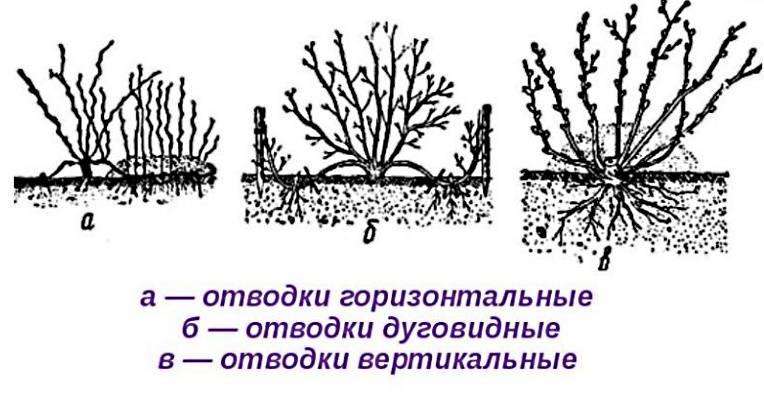 За вкореняване на хоризонтални слоеве около избрания храст се приготвят канали с дълбочина 5-7 см. Стъблата се огъват надолу, поставят се хоризонтално в каналите, закрепват се към почвата, не се поръсват със земя. Върховете на огънатите стъбла на растението се отрязват. След появата на свежи издънки върху отрязаните стъбла, приковани към земята, жлебовете се затварят с питателна почва.
